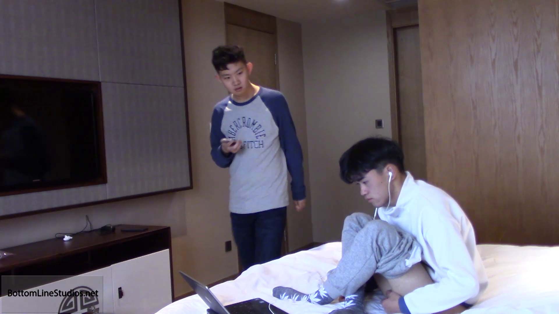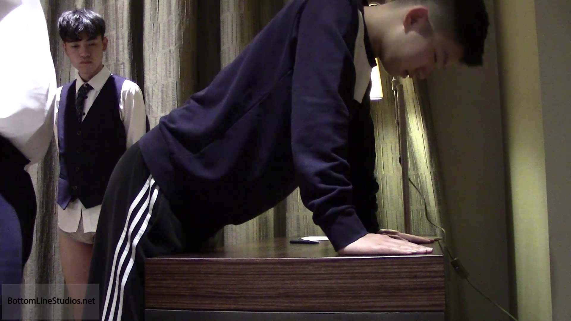Adrian Lee promptly spanks Mickey Zhu when he catches the perverted boy masturbating to porn on the computer. Hector Palaiologos follows up on Adrian's "warm up", giving Mickey a lengthy and humiliating punishment, whacking not only the boys ass, but also his feet, hands and even genitals.